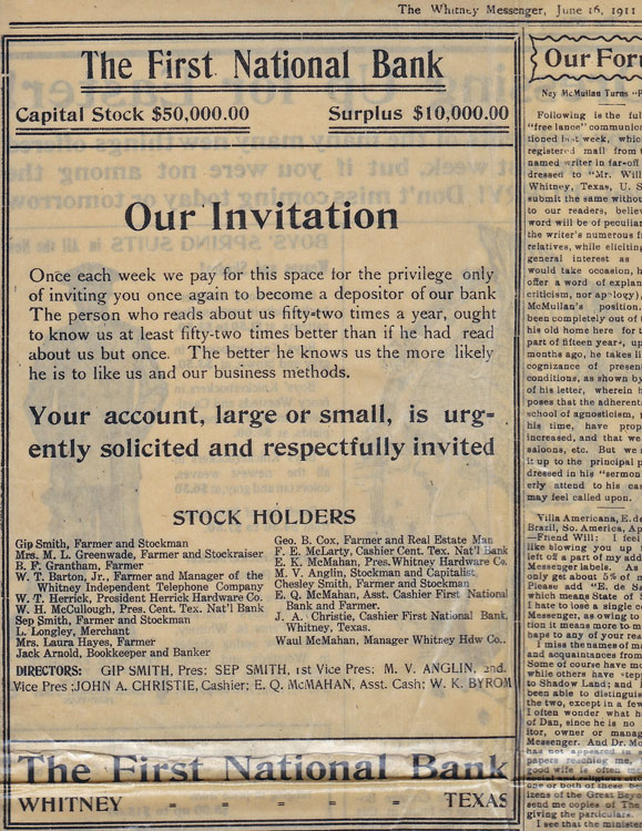 | First National Bank, Whitney, advertisement, June 16, 1911 |