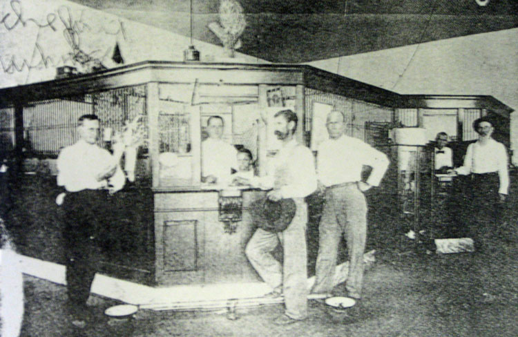 | First National Bank, Whitney, E. K. McMahan & daughter Abbie behind teller window, early 1900's |