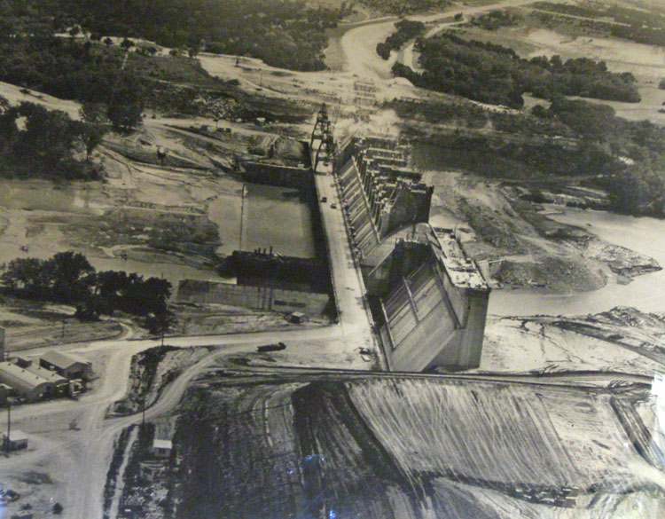 Following the end of the war, construction on the dam began in May 1947.  Governor Beauford Jester arrived for the official ground-breaking ceremony.